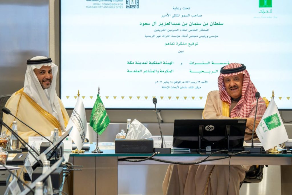 في إطار التعاون المشترك للحفاظ على التراث؛ وقع صاحب السمو الملكي الأمير سلطان بن سلمان بن عبدالعزيز، المستشار الخاص لخادم الحرمين الشريفين، مؤسس ورئيس مجلس أمناء مؤسسة التراث غير الربحية، مذكرة تفاهم مع سعادة المهندس صالح بن إبراهيم الرشيد، الرئيس التنفيذي للهيئة الملكية لمدينة مكة المكرمة والمشاعر المقدسة. وتهدف المذكرة التي وقعت الأحد ١٨ يناير ٢٠٢٦م، إلى تفعيل المواقع التاريخية والتراثية، واعداد الدراسات المتخصصة، وتنفيذ مبادرات مشتركة تبرز العمق التاريخي لمكة المكرمة تشمل بناء القدرات، وإثراء المحتوى، وإنشاء منصة رقمية موحدة لبيانات التراث، وإقامة فعاليات علمية، إضافة إلى إطلاق برامج تدريبية مشتركة للتعريف بالمواقع التاريخية والتراثية.